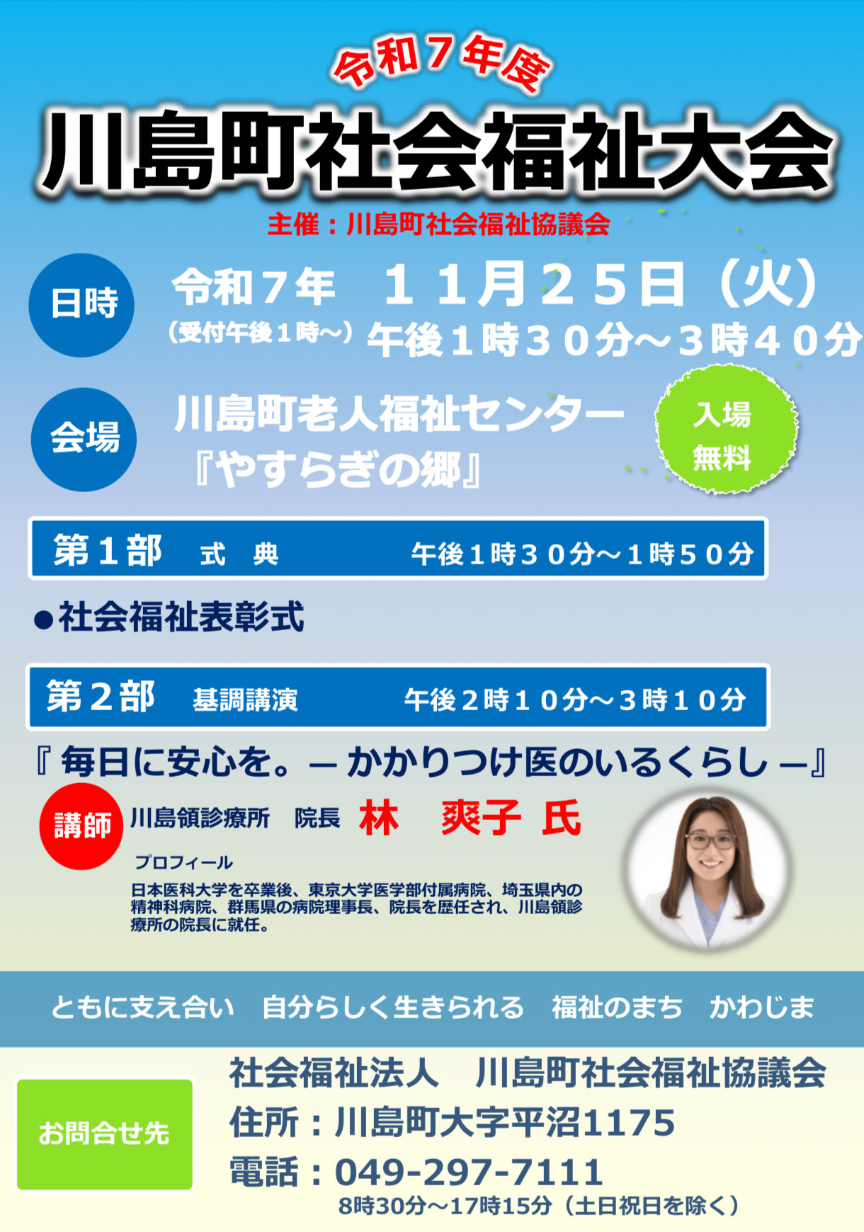 来たる11月25日(火)、川島町社会福祉協議会さまのご依頼を受け60分間の講演をおこないます。