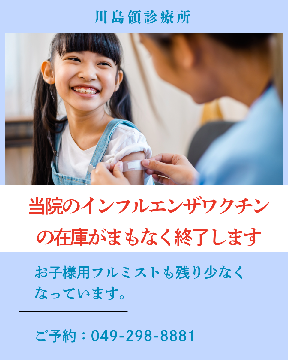 10月に開始した予防接種で、当院のワクチン在庫も残すところわずかとなりました。未接種の方は是非ご検討ください。